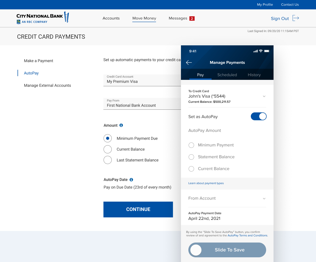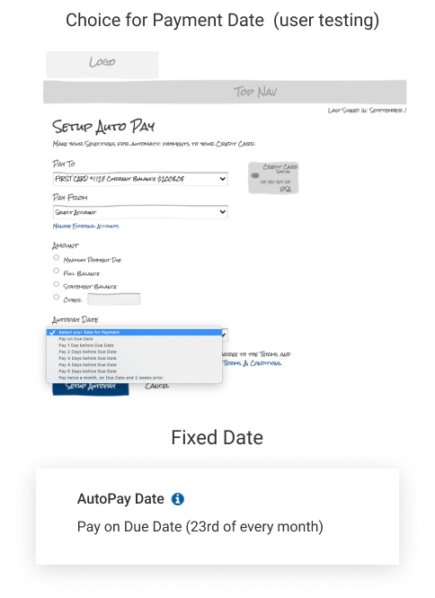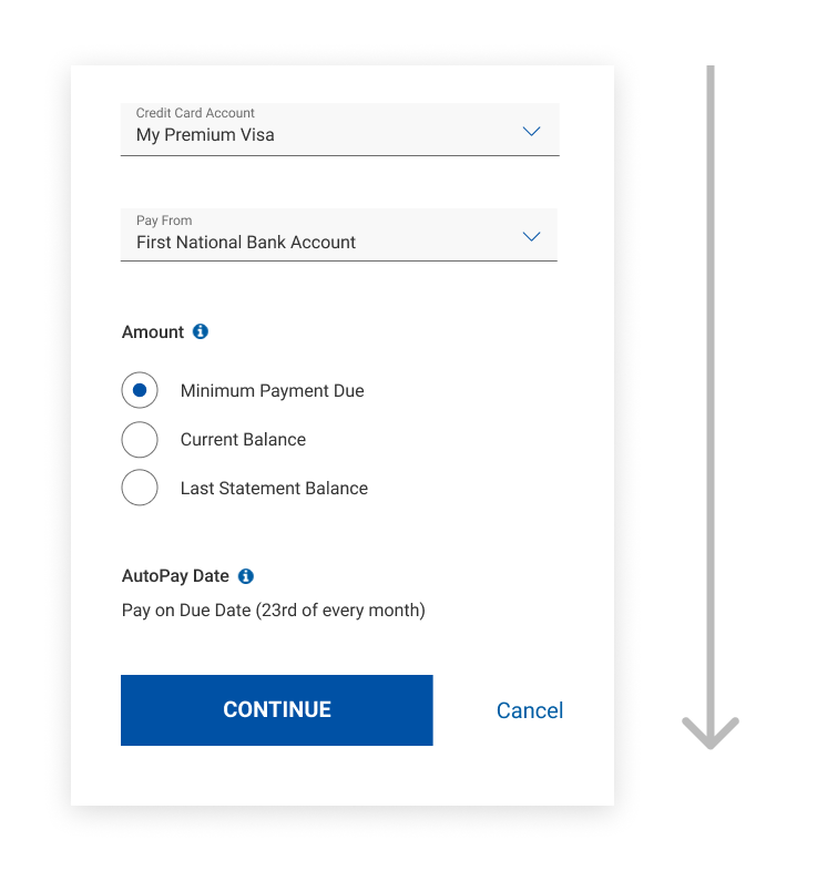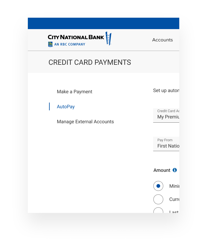 Challenge: Provide credit card users the ability to set up and manage automatic payments (recurring) on their credit card accounts. Additionally, migrate a few thousand customer's off of an antiquated third party solution to the new autopay experience.